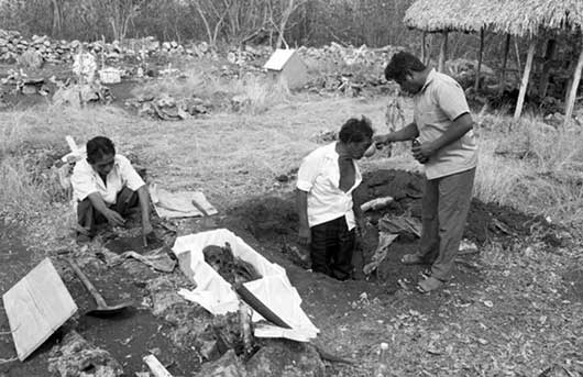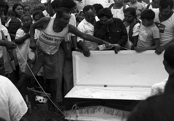 Primero es llevado, la iglesia, donde se le reza ante el altar, y luego al cementerio. En el cementerio se excava una tumba. Los familiares se arremolinan alrededor del féretro para darle el “último trago” con aguardiente.