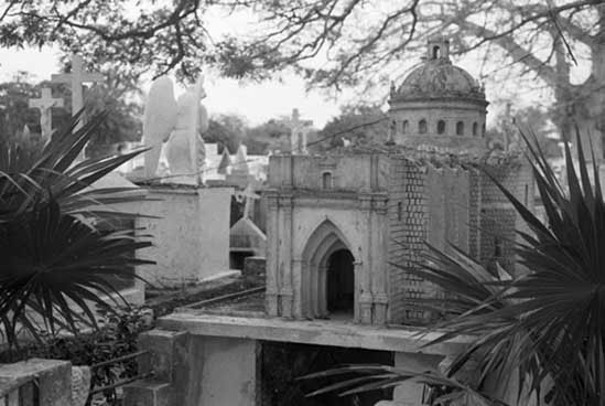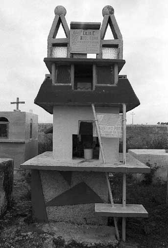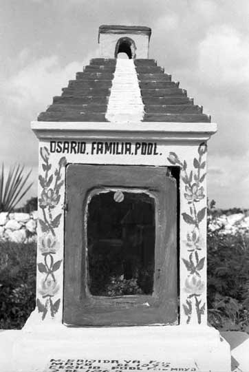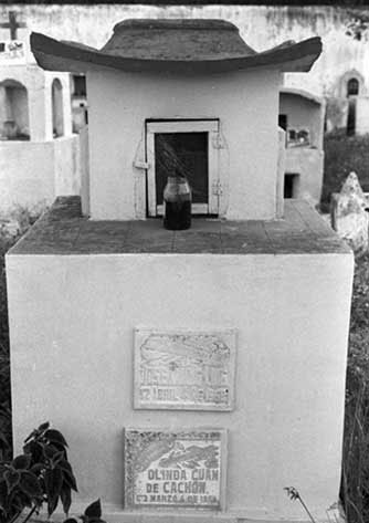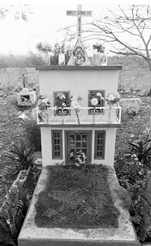 En muchos cementerios yucatecos existen mausoleos, réplicas en pequeña escala de la iglesia local. En el cementerio de Umán, Yucatán podemos apreciar la iglesia local -en pequeño