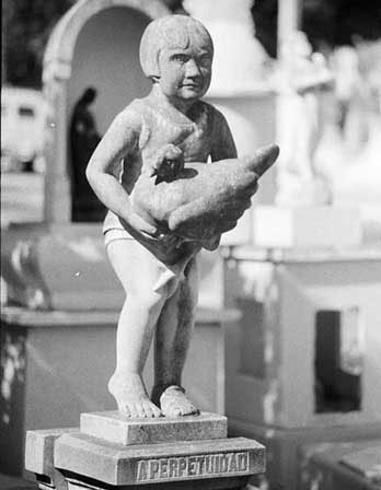 Pero también se encuentran figuras más terrenales, como la conmovedora estatuilla de una niña con su gallina, que se encuentra allá 'por perpetuidad'. |