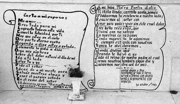 Algunas lápidas llevan todo un poema, donde cada línea empieza con una letra del nombre del ser querido. Con esa 'camisa de fuerza' la poesía no siempre logra las alturas de los sentimientos con que fue escrito. |